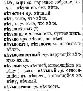 Однокоренным является слово ВЕК, которое сейчас имеет значение временного промежутка в 100 лет. А в старославянском языке оно означало телесную целостность, здоровье, а также вечность. В словаре Даля более подробно описывается значение: ВЕК м. срок жизни человека или годности предмета, продолжение земного бытия. Век обыденки - день, век дуба тысячелетие. Быт, бытие вселенной - в нынешнем ее порядке. ВѣК - WJAJK Смотреть статью ЯТЬ и Е https://dzen.ru/a/aGdkos_pNDvHuYUP ВѣК - это сферическая структура, в которой происходит структуризация управляющих алгоритмов реализации. Циклы и продолжительность существования формы зависят от пришедшего качества (задачи, смыслы, траектория). Управляющий контур формирует в среде кристаллическую форму, и эта форма - сфера. Смотреть статью Ф, Сфера, Форма, Информация https://dzen.ru/a/Z8VCA1vGEyndWdpx ВѣЧНОСТЬ в видимом смысловом варианте делится: ВѣК+НОША. НОША - NAWST: Смотреть статью НЕГА, НЕЖНОСТЬ https://dzen.ru/a/ZxnJWWv--EQ67er1 Слова вѣ