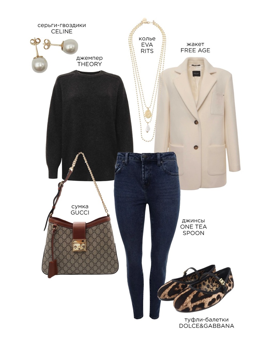 Скинни-джинсы — феникс среди трендов. Их успели предать забвению, назвать антитрендом, а затем вернуть на подиумы — но уже в обновленном формате. В 2025 году мы носим их не так, как в 2010-х: никаких чрезмерно обтягивающих моделей с ботильонами на шпильке или укороченными косухами. Теперь главные ориентиры — баланс объемов, игра фактур и неожиданные сочетания. 1. С балетками и жакетом Возвращение балеток делает скинни идеальным партнером для городских образов. Добавьте удлиненный жакет прямого кроя — и получите баланс между элегантностью и расслабленностью. Это сочетание работает как в классических цветах (черный, серый, темно-синий), так и в более экспериментальных оттенках, вроде глубокого бордо или нежного молочного. Жакет, джемпер, джинсы, сумка, балетки, серьги, колье 2. Высокие сапоги + объемный верх Жокейские сапоги и ботфорты вернулись на подиумы, а скинни — единственная модель брюк, которая идеально вписывается в это уравнение. Важно сохранить баланс: добавьте объемный верх —