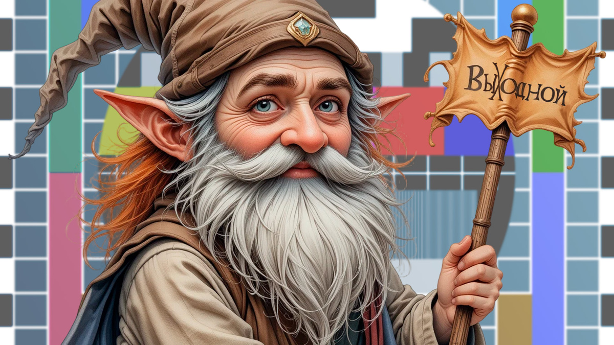 Домовой, по-моему, Горазд, тут же подсуетился, быстренько смастерил транспарант, написал на нем «Выходной» и выступил в роли модели для заставки — обложки публикации. Чтобы всем сразу всё понятно было: у автора выходной, а на канале — профилактические работы.