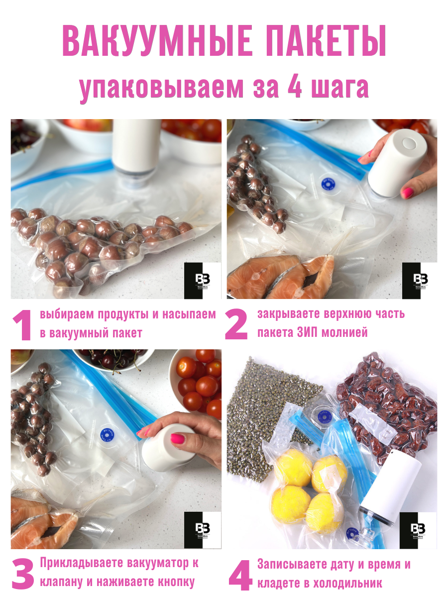 Многоразовые вакуумные пакеты BerezaBurg идеально подходят для длительного хранения продуктов, сохраняя их свежесть и защищая от влаги, воздуха и бактерий.