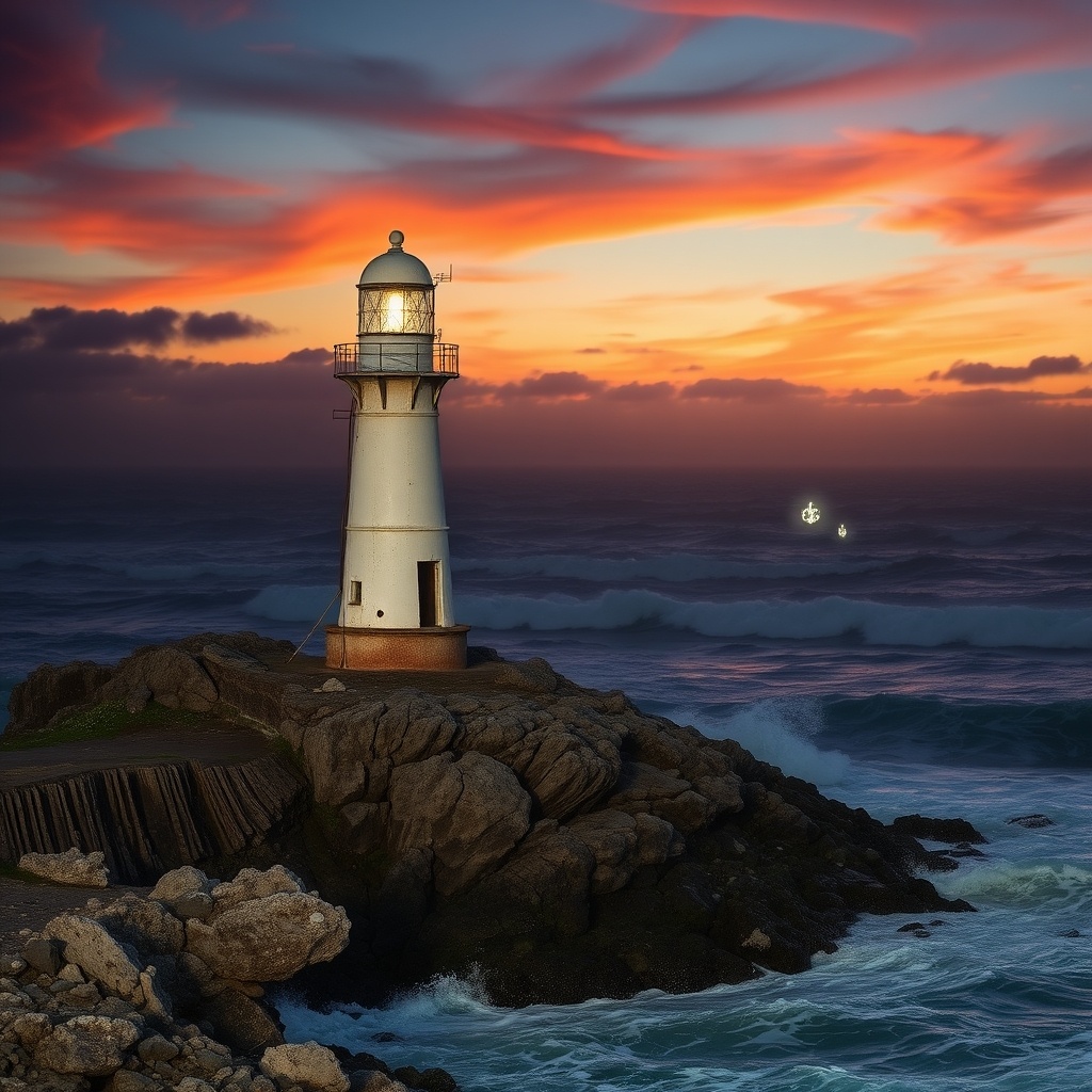 Сидя на ступенях маяка, Анна смотрела на море. Вдруг, вдалеке, она заметила мерцающие огни. Они появлялись и исчезали, как будто приглашая ее подойти ближе. Сердце забилось быстрее, и, не раздумывая, она направилась к берегу.