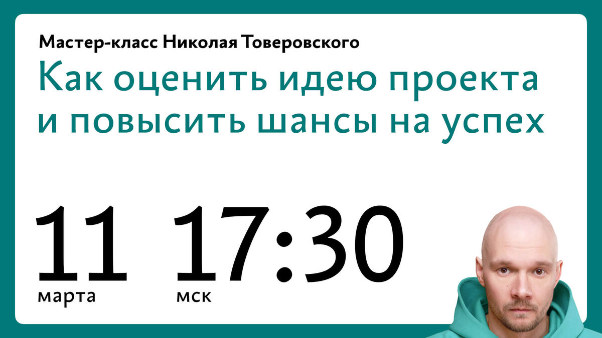 Во вторник 11 марта в 17:30 мск Николай Товеровский проведёт бесплатный мастер‑класс по оценке идеи проекта. Николай — директор Школы бюро и преподаватель дисциплины «Управление и результаты».