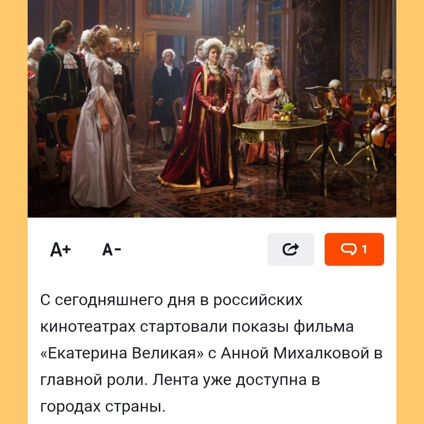 Приветствую всех читателей на канале 👋 В прокат вышел разрекламированный фильм Екатерина Великая. Как сказала мне моя подруга, на этот фильм обязательно надо сходить. Сам Владимир Мединский рекомендовал этот фильм к просмотру чтобы лучше узнать историю правления Екатерины второй и историю страны. Что мы с подругой и сделали и отправились в кинотеатр на просмотр этого исторического фильма. Пустой зал и 5 человек зрителей нас неприятно удивил. Через час просмотра люди стали покидать зрительный зал. Мы сидели до победного, но спустя минут 30 я сама предложила подруге - Может пойдем ? Тебе не надоело? Посмотрели фильм до конца. Ничего нового из фильма, что я не знала раньше из курса средней школы по истории и других исторических фильмов и сериалов про эпоху правления Екатерины второй, я не узнала. Подробный пересказ всех ее достижений упаковали в художественный фильм. Многие сцены сражений были показаны нарисованными, а не съемочными. Вставлены мнения современных экспертов. Кратко пробе