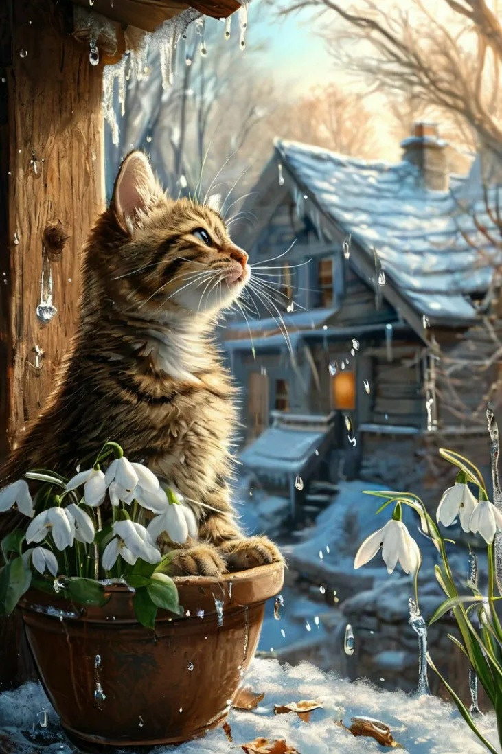 Жил-был в небольшой деревне забавный кот по имени Феликс. Он был обычным дворовым котом, но обладал чрезвычайной любознательностью и жизнерадостностью. Он знал каждый уголок своей улицы и часто отправлялся в путешествия по окрестностям. Но больше всего на свете Феликс любил весну. Как только зима начинала отступать, Феликс первым замечал малейшие изменения в воздухе. Одним мартовским днем, он почувствовал, что весна уже близка: в воздухе появился особый аромат пробуждающейся природы. Он выглянул из своего любимого убежища под крыльцом дома и потянулся на утреннем солнце. Он решил, что сегодня идеальный день для того, чтобы отпраздновать наступление весны. Прыгнув через забор, Феликс заметил, как начинают распускаться первые цветы. Это были подснежники, которые робко выглядывали из-под снега. Они казались ему чудесной декорацией для весеннего леса. Феликс обнюхал их, и сердце его наполнилось радостью. Потом кот отправился на свое излюбленное место — к старому дубу на краю леса. Обычно п