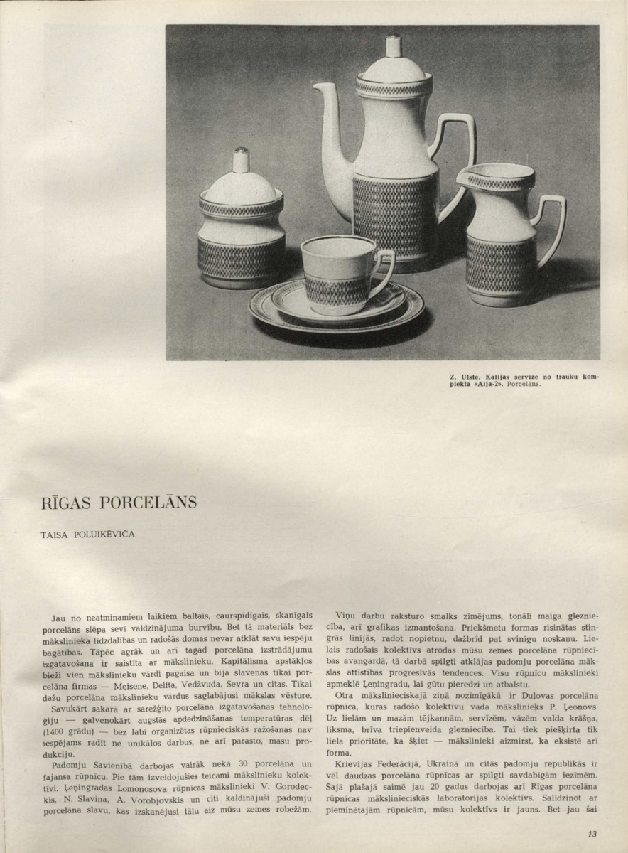 В Российской Федерации, Украине и других советских республиках еще немало фарфоровых заводов с яркими своеобразными чертами. Коллектив художественной лаборатории Рижского фарфорового завода работает в этой большой семье уже 20 лет. По сравнению с указанными заводами наш коллектив молодой. Но для этого за относительно короткий период времени рижский фарфор сформировался и приобрел собственное лицо.