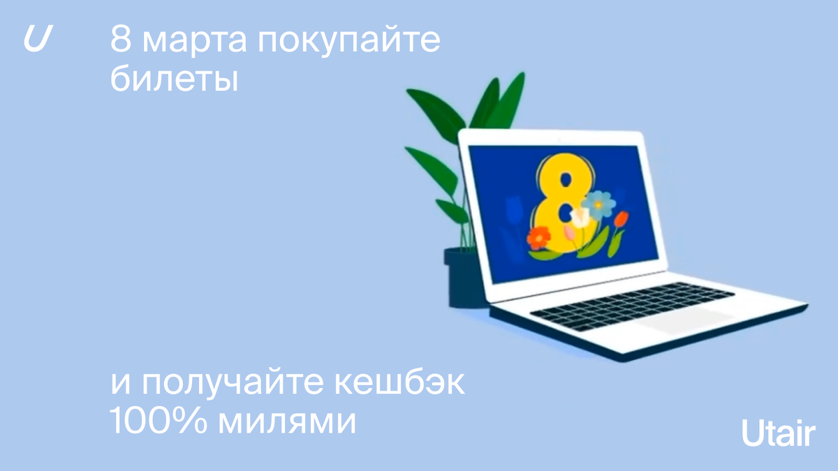 Проверьте свою удачу в нашем розыгрыше к Международному женскому дню — дарим кешбэк 100% в милях за покупку билетов по всем направлениям! Сумма кешбэка — без ограничений! Как принять участие? ⬇️ 1️⃣ 8 марта переходите на сайт utair.ru или в мобильное приложение «Уютное небо» и выбирайте любые дату вылета, маршрут и тариф. 2️⃣ Укажите номер участника Utair Status во время бронирования. 3️⃣ Оплатите заказ и проверьте, есть ли цифра 08 в конце номера билета. Если есть — поздравляем, вы победитель! ✨ На ваш счет Utair Status начислятся мили в размере 100% от стоимости билета до 14 марта! Мили можно полностью потратить на покупку билетов по любому из 120 направлений Utair! 🫶 Не упустите шанс начать весну с яркого путешествия!