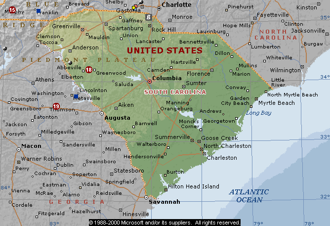 На севере Южная Каролина граничит с Северной Каролиной, а на западе и юге с Джорджией. С восточной стороны омывается Атлантическим океаном.