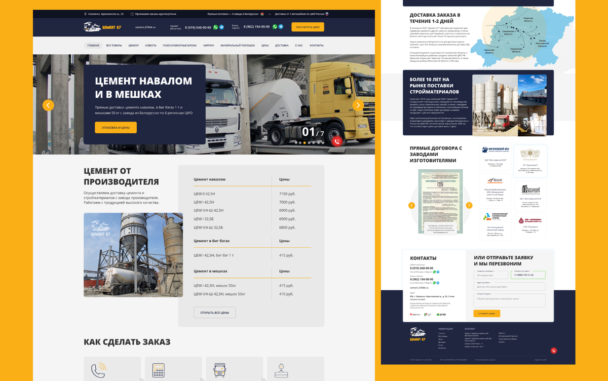 Нарисовали дизайн сайта, согласно фирменному стилю компании; а затем разработали сайт с презентацией и ценами товаров, которые доставляет компания. Также на сайте реализованы региональные страницы, адаптированные под города Смоленской области, западной части Московской области, а также регионов, в которые компания доставляет заказы. Все макеты здесь по ссылке - https://andreymaksimov.ru/cement67/ Мобильная версия: Другие работы - https://andreymaksimov.ru/portfolio/
