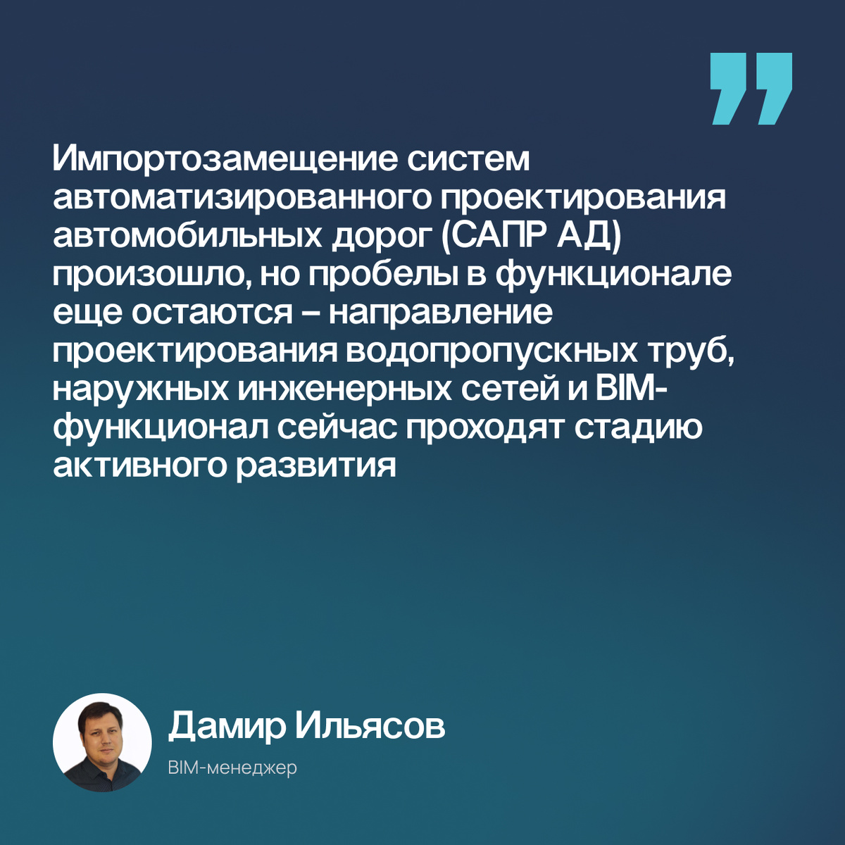 Дамир Ильясов дал комментарий об импортозамещении ПО для дорожно-транспортного строительства. Статья вышла в журнале "Дорожная Держава". А мы поделимся наблюдениями нашего эксперта в серии постов: Можно ли в настоящее время говорить об успешном импортозамещении программного обеспечения на рынке дорожно-транспортного строительства? Уровень импортозамещения зависит от класса и специфики программного обеспечения. Например, системы автоматизированного проектирования (САПР), используемые при обработке результатов инженерных изысканий и проектировании дорожной части, в России развиваются давно. САПР конкурируют как с зарубежными аналогами, так и друг с другом. Еще до возникновения острой необходимости в импортозамещении они занимали весомую долю отечественного рынка. Основными преимуществами перед зарубежными аналогами были высокая адаптированность программных продуктов под наши нормативные требования и методы проектирования, а также поддержка и учет пожеланий пользователей. По наблюдениям с