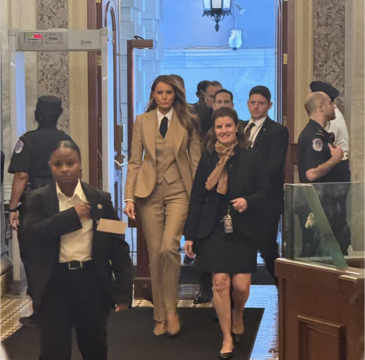 За образами первой леди США очень интересно следить, потому что выглядит Мелания Трамп всегда потрясающе, всегда выверено, уместно и аккуратно. Самые яркие образы, в которых супруга президента Дональда Трампа в первый его срок выходила в свет мы собрали и обсуждали здесь. А сейчас посмотрим на первое после инаугурации появление Мелании. Повод - выступление Мелании в Конгрессе в поддержку безопасности в интернете. Для него был выбран приталенный костюм-тройка Ralph Lauren светло-коричневого цвета, состоящем из укороченного жилета, прямых брюк и жакета. Также на ней была белоснежная рубашка и черный галстук, а завершили образ туфли бежевого цвета. Как вам образ первой леди США?