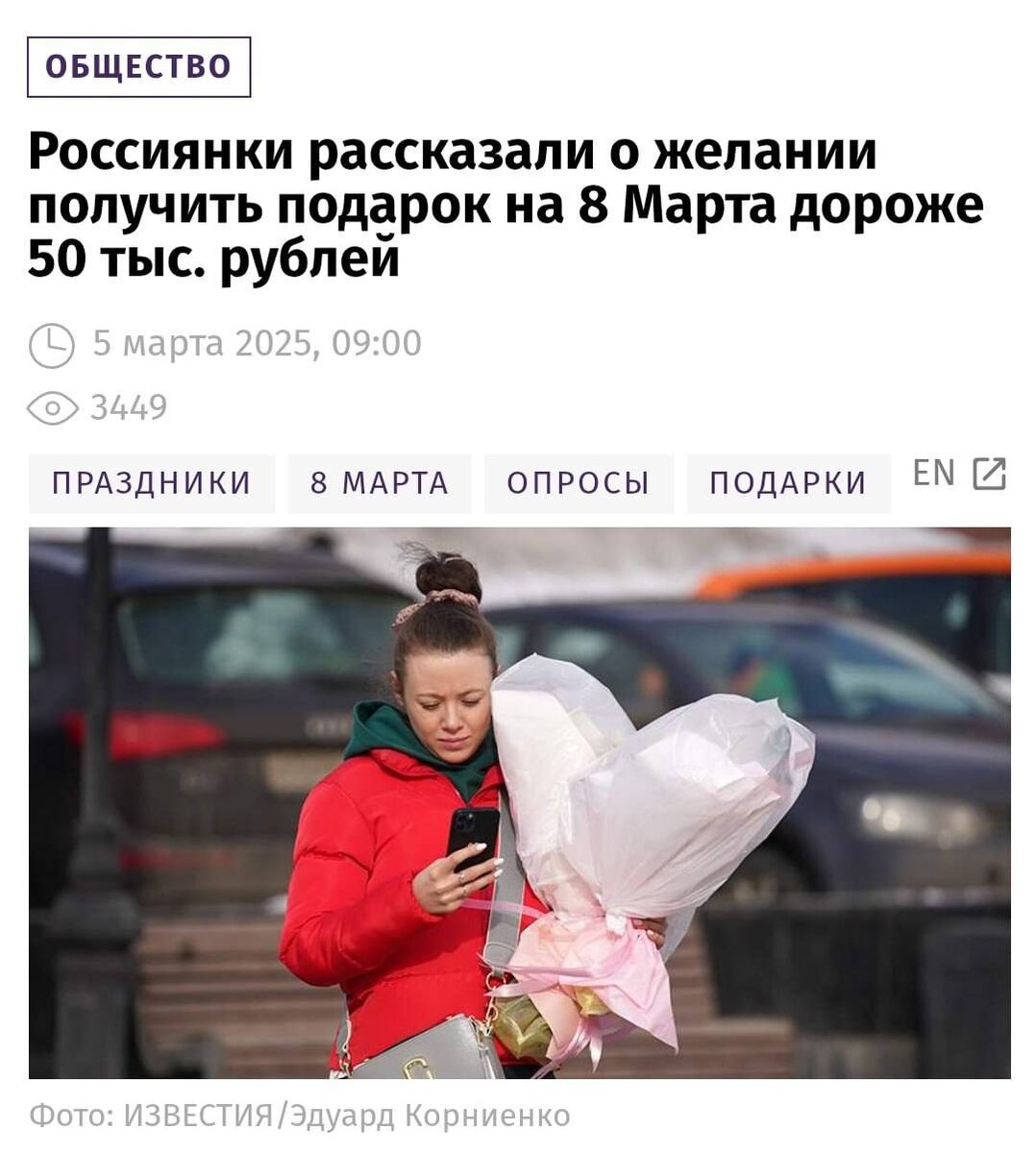Ну, что, граждане мужчины, каждый получил 2 недели назад носки и пену? Теперь готовьте денежки к женскому празднику))) Пока не поздно, может ещё успеете кредит оформить, вероятно ещё не все отключили функцию оформление кредита удалённо через Госуслуги?) Каждая четвертая россиянка хочет получить на 8 марта подарок не дешевле 50 тысяч рублей, а мужчины планируют уложиться в 3 тысячи рублей. Экий разброс ожидания и возможностей. Даже не на порядок… Ну а что? Считаю, наши женщины заслужили хорошие подарки. Ведь даже приличный букет вряд ли будет стоить 3К, хоть нам правительство пообещало, что женщины без цветов не останутся, но тем не менее цветы уже чет выросли в цене… И сильно подозреваю, что ещё вырастут… Ещё 12% дам мечтают о машине, квартире и других дорогих подарках, Мальдивы например... Но хочу наших дорогих мужчин немного подбодрить и утешить, тут прошла новость: Премьер-министр России Михаил Мишустин подписал постановление «О единовременной выплате гражданам мужского пола». Со