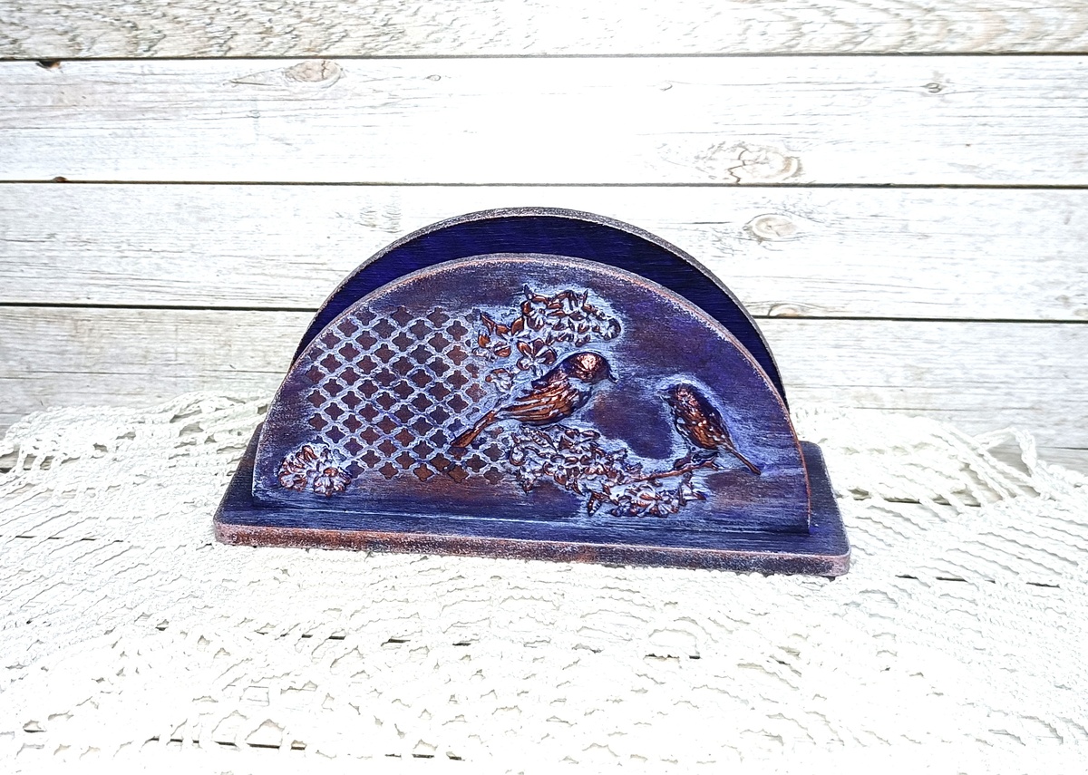 Бывает ли у вас так, что внезапно пришла мысль, внезапно что-то сделал, а только потом подумал - а оно зачем вообще надо было? И к чему это)))? У меня часто бывает😁. Так произошло и с этой салфетницей. У меня случился припадок "срочно что-нибудь подекорировать", а тут и повод есть к 8 Марта. Взяла я заготовку, на молдах сделала отминку птичек и цветов, приклеила их, добавила фон шпатлевкой через трафарет и получила хорошую основу для дальнейшей работы. Щедро закрасила всё жгучим фиолетовым цветом. Разумный человек либо грамотно поиграл цветами дальше, либо просто оттенил рельеф, либо... сделал что-то еще красиво-правильное. Но мне стукнуло в голову посмотреть, как будет выглядеть состаривание предмета, если замазюкать узоры голубой краской, а потом стереть ее влажной тряпочкой. Прием не новый, многие так делают - выделяют рельеф, так сказать, обратным способом. И я размахнулась))). Покрыла краской, стерла излишки, а потом полусухой кистью прошлась бронзовой акриловой краской. Получила