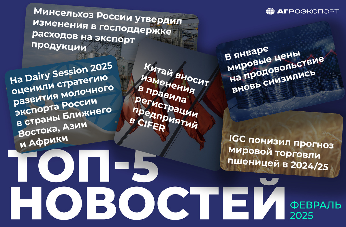 📚 На Dairy Session 2025 оценили стратегию развития молочного экспорта России в страны Ближнего Востока, Азии и Африки. AgroXXI.ru ✅ Минсельхоз России утвердил изменения в господдержке расходов на экспорт продукции. Агроэксперт 🇨🇳 Китай вносит изменения в правила регистрации предприятий в CIFER. Агроэкспорт 💱 В январе мировые цены на продовольствие вновь снизились. FAO 📉 IGC понизил прогноз мировой торговли пшеницей в 2024/25. IGC