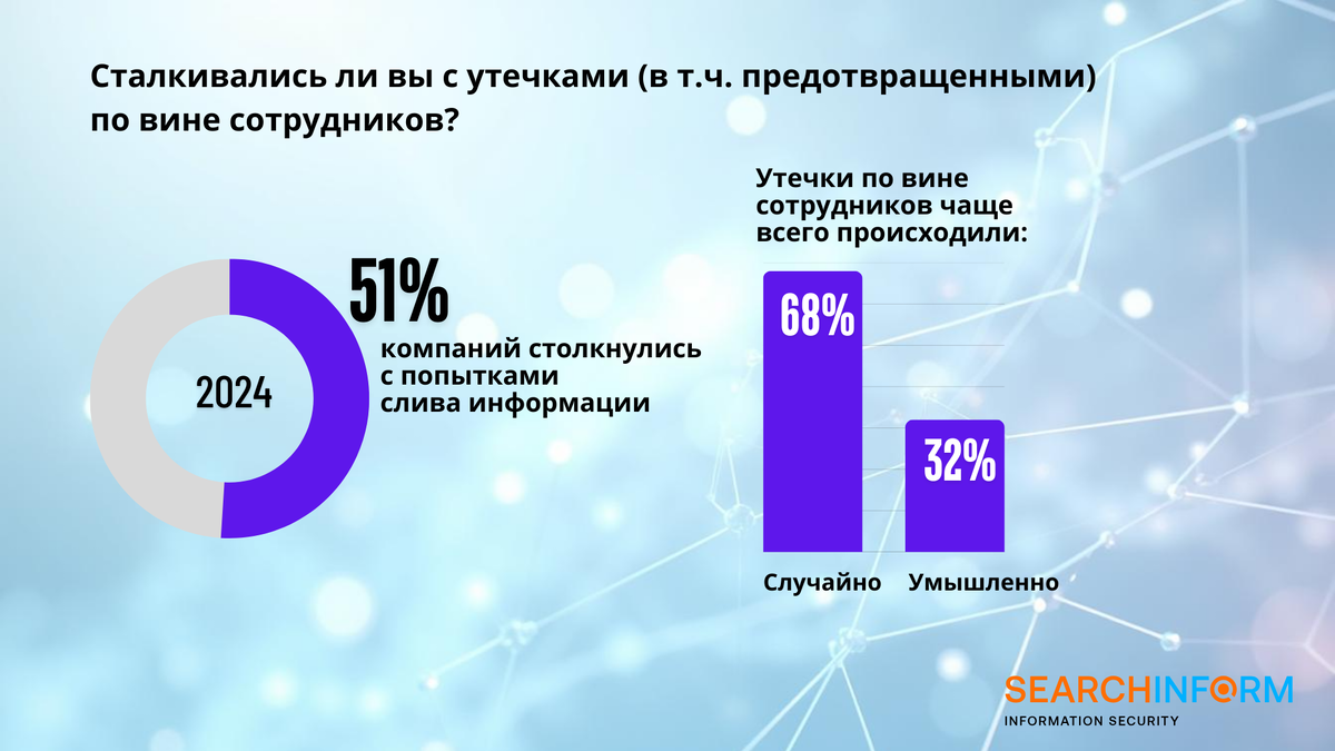 Результаты ежегодного исследования компании «СёрчИнформ». Объекты КИИ подвержены высоким киберрискам. По данным RED Security, в 2024 году на объекты критической информационной инфраструктуры (КИИ) пришлось 64% всех атак. Не меньше угроз несут утечки информации по вине сотрудников, которые имеют легитимный доступ к системам КИИ. В 2024 году 51% организаций, относящихся к субъектам КИИ, столкнулись с утечками информации по вине сотрудников. При этом все еще велик риск случайных инцидентов: в 68% случаев сотрудники допускали утечку из-за ошибок и незнания базовых правил кибергигиены. В 2024 году субъекты КИИ чаще всего фиксировали угрозу утечки информации о клиентах и сделках (43%), персональных данных (35%) и технической документации (34%). Об утечках финансовой документации и интеллектуальной собственности сообщили 29% и 19% опрошенных.* Топ-каналов фаворитов, через которые сотрудники сливали информацию в 2024 году: мессенджеры (51%), почта (59%), устройства хранения (34%) и фото на сма