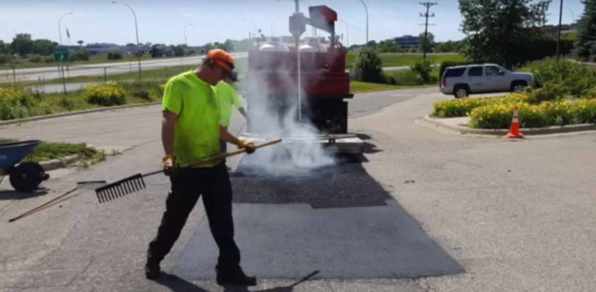 - Асфальту требуется около 8–12 минут, чтобы размягчиться, и как только это будет сделано, задняя часть граблей используется для «обрамления» ремонтируемой области. Затем грабли используются для разрыхления асфальта как можно глубже в пределах обрамленной области. Традиционные методы добавляют горячий асфальт в холодную выбоину, и хотя это заполняет отверстие, ремонт не является бесшовным, что приводит к поломкам в будущем.