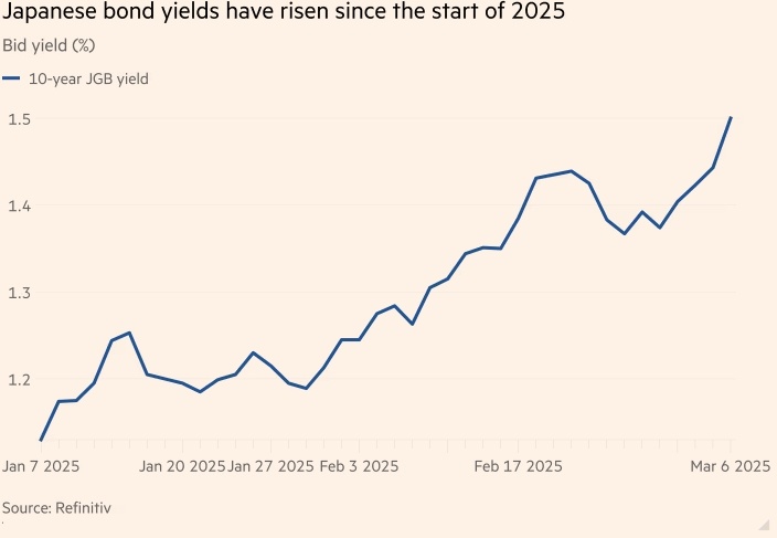 Доходность десятилетних государственных облигаций Японии выросла на 0,06 процентных пункта и составила 1,5%. Это самый высокий показатель с 2009 года. С начала 2025 года доходность JGB выросла почти на 0,4 процентных пункта.