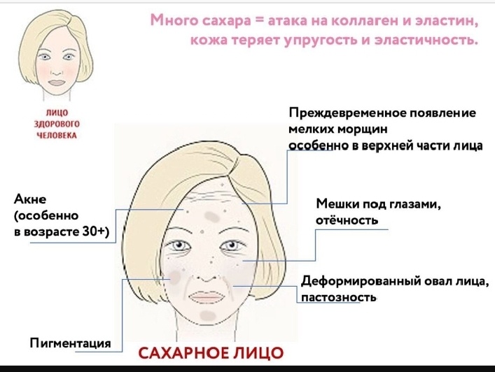 Молекулы сахара убивают молекулы коллагена. Коллаген – белок, отвечающий за эластичность и упругость кожи. Таким образом, провоцируется появление морщин, есть даже такой термин – «сахарное лицо», это лицо серого цвета, с глубокими морщинами. Сахар влияет на структуру, силу коллагена и природных антиоксидантных ферментов, вырабатываемых нашим организмом, делая кожу уязвимой к повреждениям от загрязнения, ультрафиолетовых лучей и свободных радикалов, которые вызывают окислительный стресс и заставляют нас стареть быстрее. Сахар старит кожу из-за процесса гликации. Молекулы сахара, а конкретно глюкозы, вступают в реакцию со структурными белками кожи (коллагеном и эластином). Повреждённые белки медленнее распадаются, а новые хуже синтезируются . В результате гликирования белков коллагеновые и эластиновые волокна уплотняются, ухудшается структура кожи, что приводит к появлению заломов и углублению имеющихся морщин. Также происходит отвердевание соединительной ткани, уменьшается количество жи