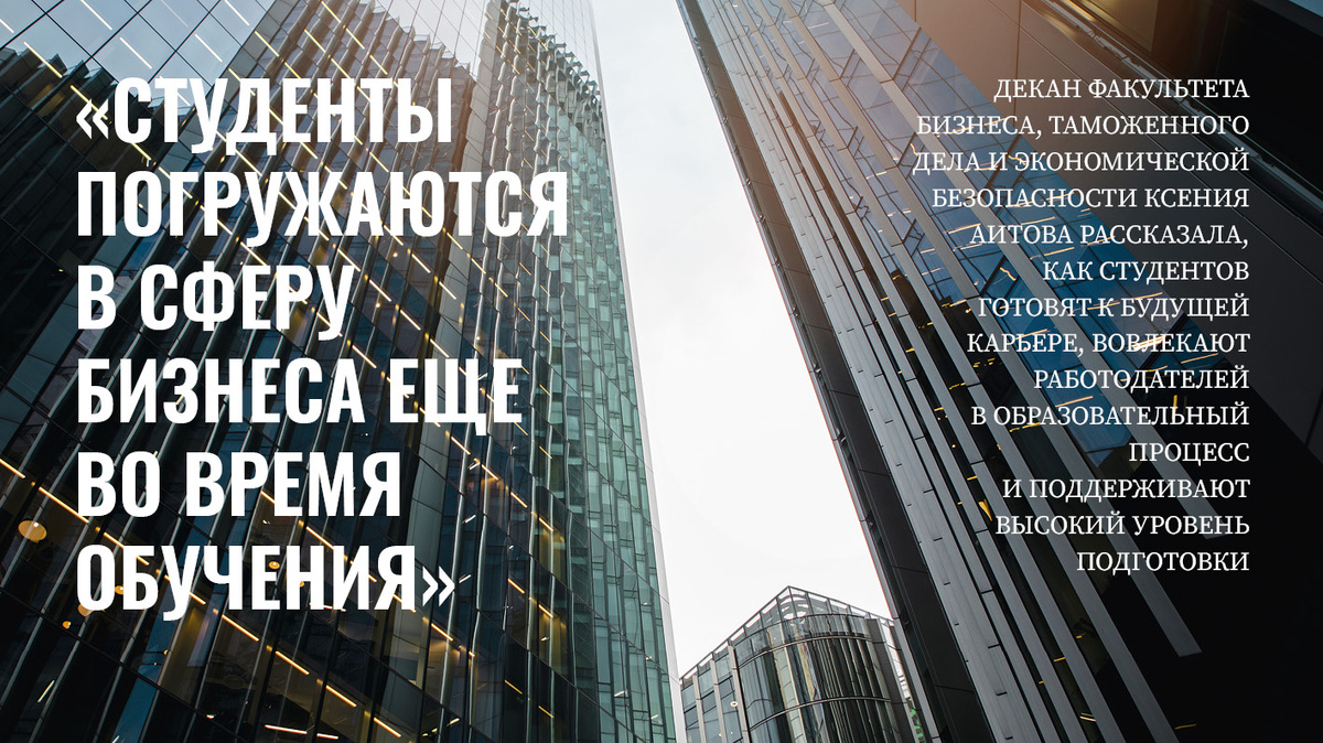 Декан факультета бизнеса, таможенного дела и экономической безопасности Ксения Аитова рассказала, как студентов готовят к будущей карьере, вовлекают работодателей в образовательный процесс и поддерживают высокий уровень подготовки выпускников.