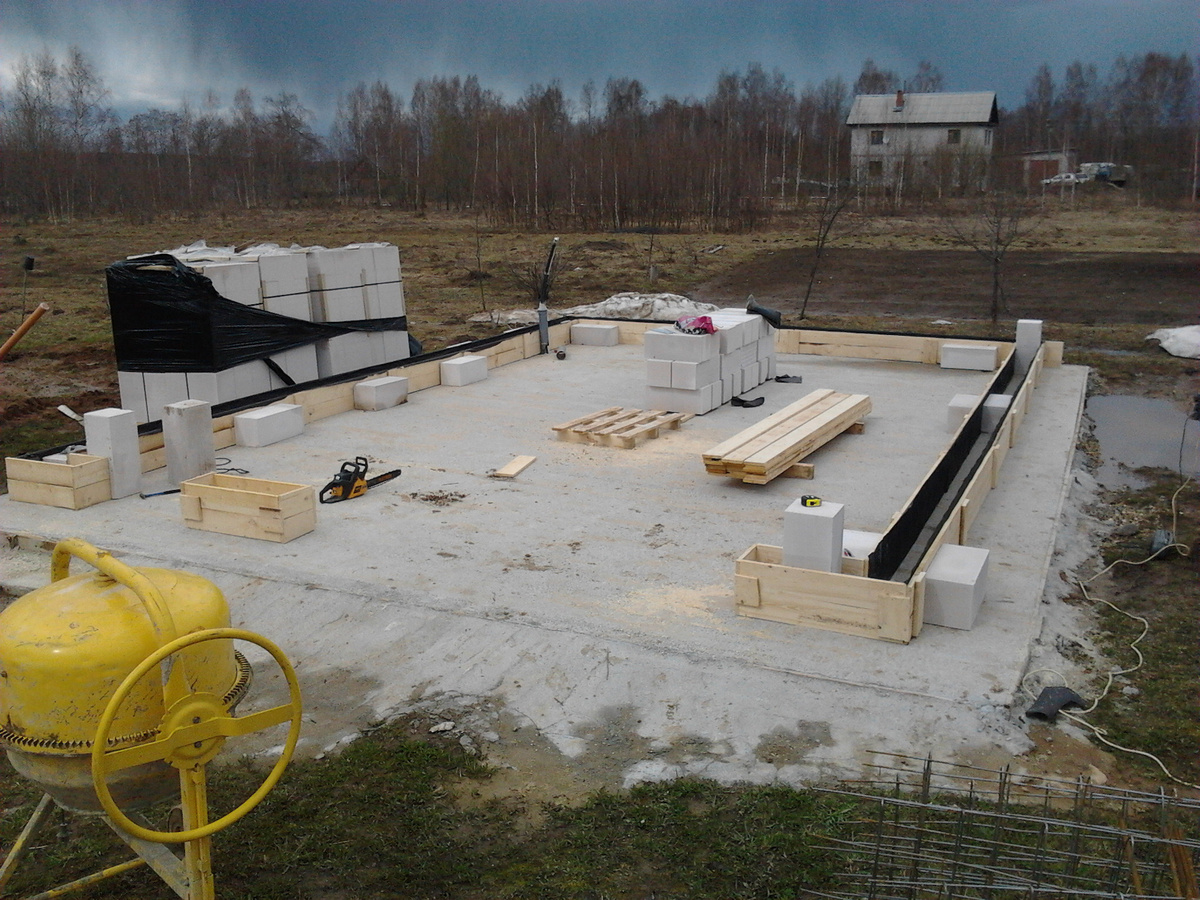 Став скромным землевладельцем, возникла необходимость где-то ночевать и хранить всякие грабли-косилки на своем участке, проживание в палатке не самый комфортный вариант. Для начала накопал колодцев, целых три, один — воду черпать, другие два — г**но сливать. Соединил это все трубами да канализацией и залил сверху плитой бетонной и армированной. На том деньги и время в первый сезон и кончились. Сначала планировался каркасный сарай-гараж, но за зиму он в голове трансформировался в блочный (яж там варить-пилить буду!) и двухэтажный (не пускать же жену и детей в гараж :) Поэтому решил усилить немного плиту цоколем, бетонным с армированием. Залить из миксера, как поступил с плитой, не вышло, т.к. сыровато весной было, а памятник из миксера со вставшим бетоном на въезде на участок мне ни к чему. Дальше — больше. Каменщиков нигде не нашел, пришлось осваивать эту технологию самому. Залил армопояс между 1 и 2 этажами. Возиться с миксером больше страсть как не хотелось, вызвал бетономеша