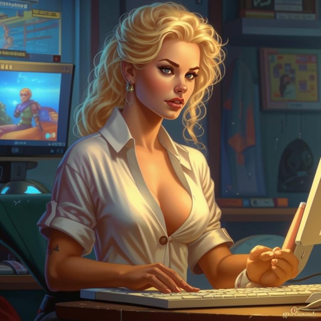 И мы направились к столу, где работала за компьютером с е к с у а л ь н а я блондинка с выдающимися формами, обтянутыми шелковой блузкой. Пуговица на груди грозилась отлететь и открыть взору ее невероятные достоинства.