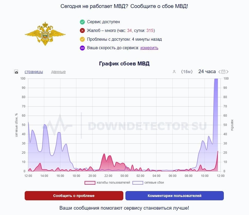 В России произошел массовый сбой работы сайтов МВД, следует из данных сервиса Downdetector. Интернет-пользователи сообщают, что не загружается страница сайта министерства внутренних дел. Соответственно, люди не могут проверить статус своих обращений в министерство. Причины технического сбоя не уточняются. Отметим, что чаще всего жалобы поступают от жителей Карелии и Камчатского края. На момент публикации новости сайт МВД Башкирии работал в обычном режиме. Напомним, ранее крупный сбой произошел в работе Рунета.