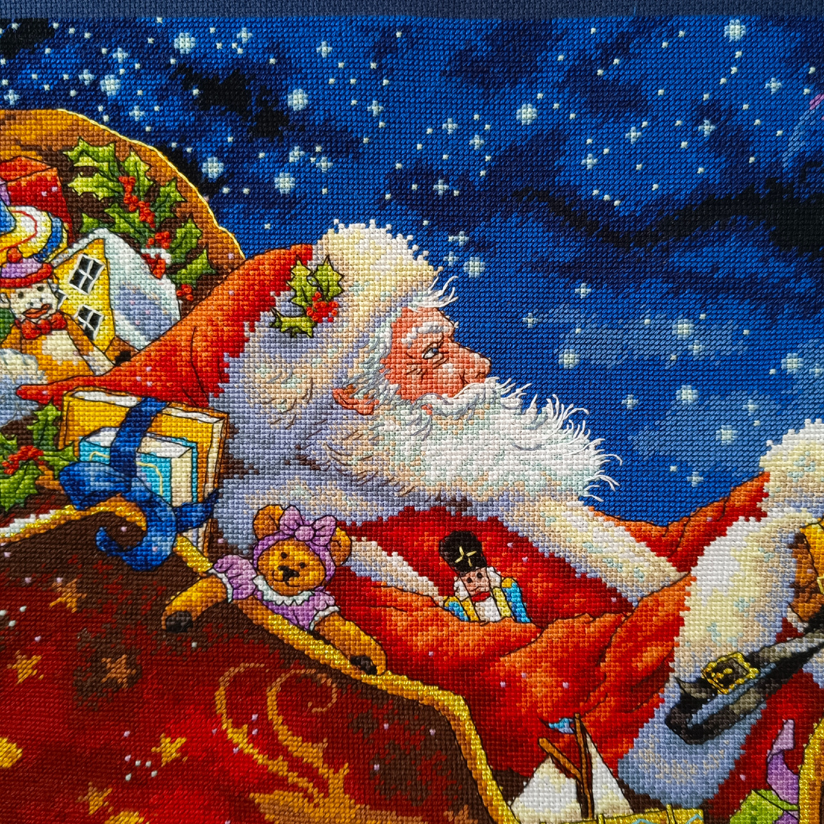 И я уже приступила к его реализации! Мои промежуточные итоги- сейчас покажу и расскажу. Последнее видео о моей вышивке было в декабре 2024-го, и я показывала начатый процесс - набор " Ночная поездка Санты" от Дименшенс на 18-ом каунте темно-синей канвы. С тех пор видео так и не сняла, но работу давно закончила, на неё у меня ушло 35 дней (из них 3 дня - бэкстич). Надеюсь, видео все-таки будет у меня чуть позже, а пока хочу показать вам фото моей готовой работы: Обалденный результат! Я в полном восторге! Могу петь оды этому сюжету бесконечно! Он великолепен! И всё тут) После этого прекрасного финиша я сразу же начала ещё один новогодний набор Дименшенс, но ещё больше по размеру... Он пока у меня не готов - крестики и полукрестики вышиты, остались бэкстич и ему сопутствующие декоративные и отделочные швы. Но я хочу показать промежуточный итог, так сказать: очень нравится то, что уже сейчас вижу на канве этого процесса) но то ли ещё будет, когда выполню всю отделку до конца?))) Чем же