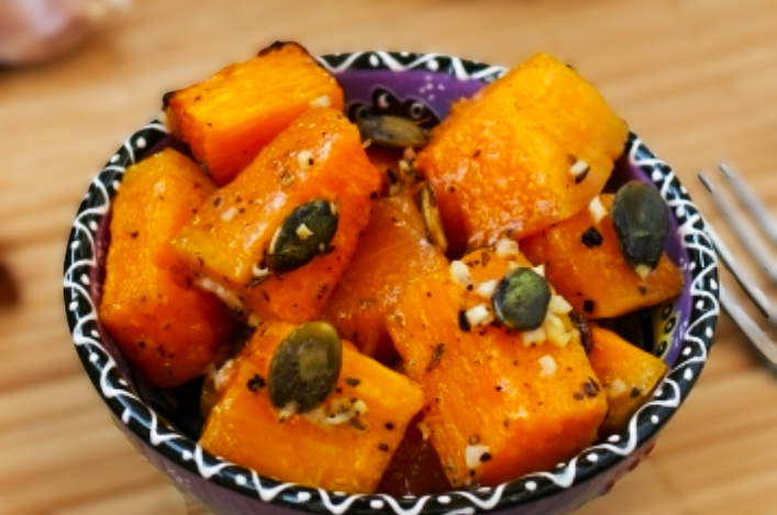 Время приготовления: 1 час 10 минут Питание на порцию; Кал-85, Белок-1,2г, Жир-5,5г, Углеводы-7г, Ингредиенты: Тыква - 1 кг Чеснок - 2-3 зубчика Орегано - 1 ч.л. Тыквенные семечки - 1 горсть Соль, перец - по вкусу Масло подсолнечное - 6 ст.л. Приступаем к готовке! Тыкву почистить и нарезать небольшими кусочками. Сложить тыкву в глубокую миску, в которой будет удобно перемешивать. Посолить и поперчить. Добавить растительное масло и хорошо перемешать. Добавить к тыкве измельчённый чеснок, орегано и тыквенные семечки. Перемешать. Сложить все ингредиенты в керамическую форму для выпекания. Разогреть духовку до 200 градусов и запекать тыкву 40 минут до желаемой мягкости. Запечённая тыква с орегано и тыквенными семечками получается очень ароматной и вкусной! Приятного аппетита!
