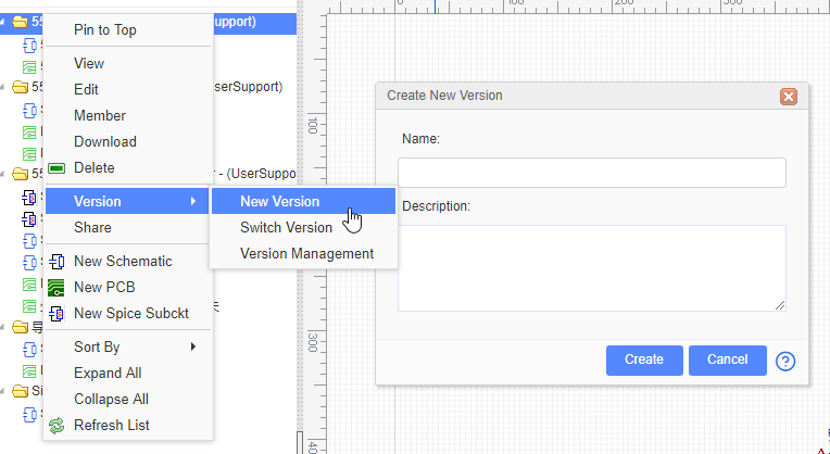 EasyEDA предоставляет простую, но мощную функцию контроля версий. Каждая версия независима, вы можете редактировать и сохранять каждую версию. При создании нового проекта имя по умолчанию будет установлено как "master", вы можете изменить его с помощью команды "Project Manage - Version". Вы можете создать до 10 версий для каждого проекта. Чтобы создать новую версию, необходимо сначала удалить старую. Используйте: Project folder - right-click menu - Version - New Version В диалоговом окне новой версии вы вводите название и описание версии, а затем создаете ее. Чтобы переключиться на другую версию, используйте "Version - Switch Version". Нажмите "Switch", в диалоговом окне появится список текущей версии и всех других версий для этого проекта, вы можете выбрать одну из них. Примечание: Использование "Version Management" откроет "Project Page - Version". в котором будут перечислены все версии. Вы можете изменить название и описание каждой версии или удалить их. Текущая версия не может быть