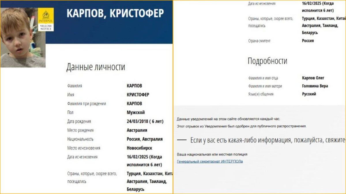 Интерпол объявил в розыск шестилетнего мальчика, которого похитил отец на глазах матери во время прогулки в Новосибирске. Это следует из карточки на официальном портале Интерпола. Так, карточку пропавшего мальчика сопровождает пометка о «желтом уведомлении», которая предусмотрена для поиска и идентификации пропавших без вести лиц, в том числе несовершеннолетних. По данным Интерпола, мальчик мог уже побывать в таких странах, как Турция, Казахстан, Китай, Таиланд и Белоруссия. Ранее появилась информация, что горе-отец через адвокатов предоставил доказательство того, что ребенок находится с ним в Австралии. На странице во «Вконтакте» правозащитница Анна Тажеева выложила видеообращение мамы мальчика Веры Головиной, где та говорит, что с ней связались адвокаты бывшего мужа и заявили, что отец с сыном приземлились в Австралии еще 1 марта. При этом точного подтверждения этому нет. Сотрудники же правоохранительных органов утверждают, что мальчик не пересекал границу России. Напомним, ребенка и