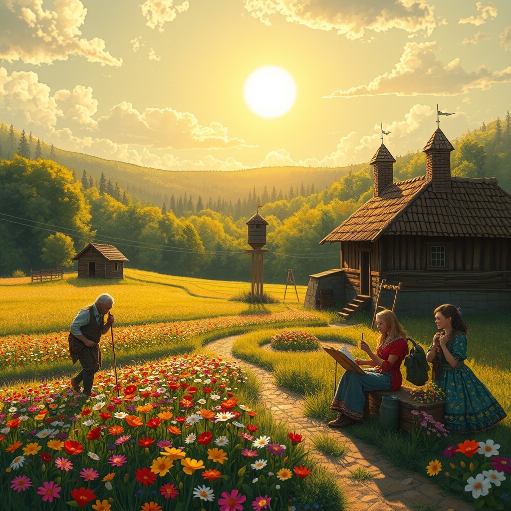 В деревне также жил Дима, парень лет двадцати, который всегда мечтал стать художником. Он рисовал на старых кусках картона, заполняя их цветами и пейзажами родной земли. Но с каждым годом его мечты казались всё более недостижимыми. Дима часто сидел на краю поля и смотрел на горизонт, где сливались небо и земля, мечтая о жизни в большом городе, полном возможностей и вдохновения.