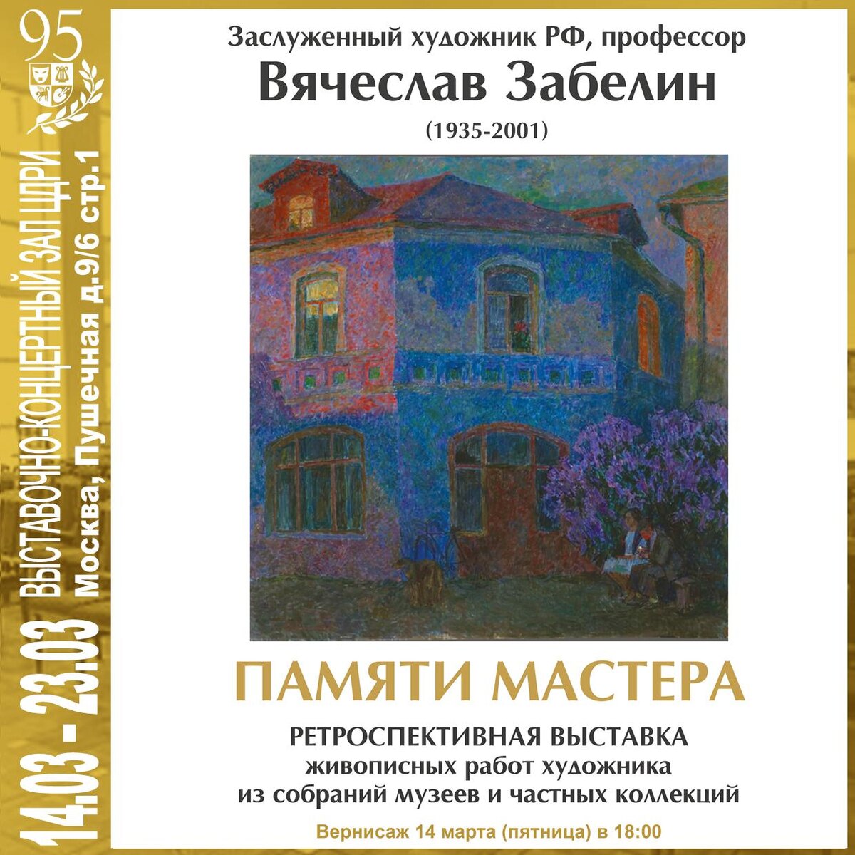 с 14 по 23 марта 2025 г. Заслуженный художник РФ, профессор Вячеслав Забелин (1935 – 2021) Ретроспективная выставка живописных работ художника из собраний музеев и частных коллекций. Вернисаж 14 марта (пятница) в 18:00 Выставочно-концертный зал Центрального Дома работников искусств Часы работы выставки: