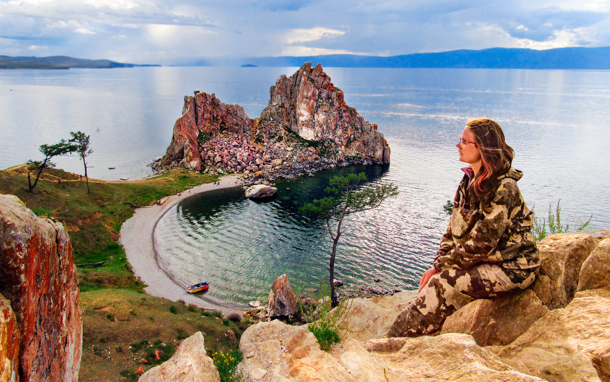 Зайдя за скалу, мы причалили к берегу в живописной бухточке мыса и расположились на обед наблюдая, как отдыхавшие у подножия скалы туристы быстро засобирались из-за начавшегося легкого дождичка. Да, не ожидали мы попасть под дождь на Ольхоне 🙃