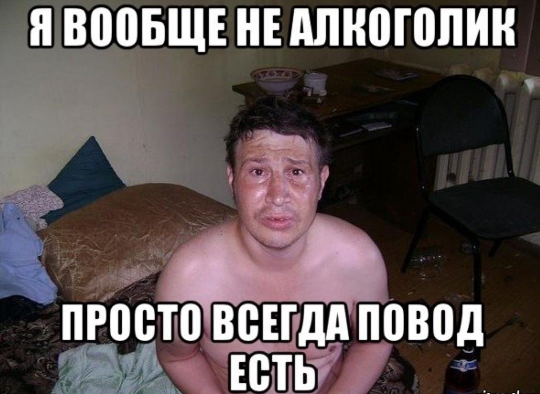 Я никого НЕ призываю бухать, просто всякие поводы не нужно выдумывать, чтобы выпить, когда захотели. Главное не спиваетесь люди, не превращайтесь в животных. Есть в обществе такое мнение, что без повода и в одиночку пьют только алкаши и я с этим не согласен, это очередной миф. Я эти слова много раз слышал и кто их придумал непонятно. Вообще то как раз таки алкоголики ищут постоянно повод выпить, чтобы наоборот не казаться алкоголиками. Понимаете? Почему я должен искать повод выпить, если захочу? Иначе буду считаться алкашом, потому что захотел бухнуть без повода? Ну что за дебилизм в обществе с советских или с каких времён? Столько стереотипов придумано, ужас. Зачем повод искать? Пошёл да выпил, когда захотел и всё, без повода, главное не спиваться, в запои не уходить и часто не бухать. Повторю, это алкоголики любой повод ищут выпить тем самым обманывая себя, что они не алкоголики. Переживают за кого то из родственников, надо выпить, поругались с кем то, надо выпить, полнолуние, над