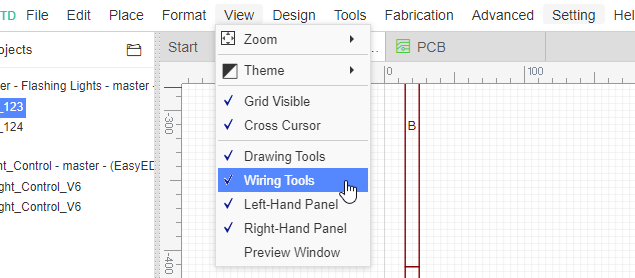 Если вы спрятали инструменты, их можно открыть отсюда: Верхняя панель инструментов Верхнее меню > View > Wiring Tools...