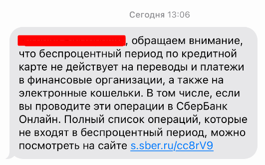 Вчера Сбербанк своим клиентам разослал СМС с вот таким текстом. Тем самым уведомил клиентов, о том, что льготного периода НЕ будет за переводы на Финуслуги или Банки.ру и другие. Напомню 17 февраля, банк добавил "Перечень юридических лиц, платежи и переводы в адрес которых не попадают в беспроцентный период по кредитным картам" Но в файле всё ещё есть пометка "*По мере технической реализации" и вчера некоторые пользователи нашего чата совершали переводы на Финуслуги и сегодня процентов нет, всё ушло в льготный период. Задним числом банк не должен насчитать проценты, по крайней мере, так утверждает поддержка банка. Если вы хотите быть в курсе последних новостей про снятие наличных с карты Сбербанка, то подпишитесь на наш канал и чат в телеграмме. ➡️ И не забывайте подписываться на телеграм-канал и телеграм-чат. Там мы делимся акциями и выгодными предложениями от банков и обсуждаем интересные темы.