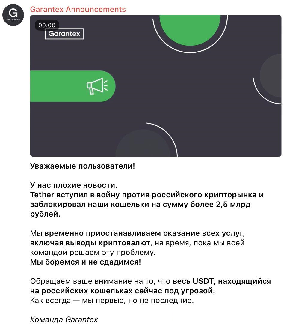 Tether заблокировал кошельки Garantex на 2,5 млрд рублей. Все услуги Garantex временно приостановлены, пока команда решает проблем Гарантекс давно находится под пристальным вниманием США. Американские медиа, включая Wall Street Journal, неоднократно публиковали материалы, обвиняющие платформу в содействии финансированию российской оборонной промышленности. Эти публикации формировали мнение мирового сообщества и подготавливали почву для дальнейших действий против биржи. Недавняя блокировка USDT-кошельков Garantex на сумму 2,5 млрд рублей (около 27 млн долларов) станет важным событием в долгосрочной перспективе. Хотя эта сумма не критична для общего объема финансовых операций на рынке СНГ, сам факт заморозки активов является сигналом к изменению стратегии работы участников крипторынка. Garantex традиционно выступал ориентиром для определения курса USDT в регионе, формируя его на основе спроса и предложения. Даже после введения санкций платформа сохраняла свое влияние на транзакции с крип