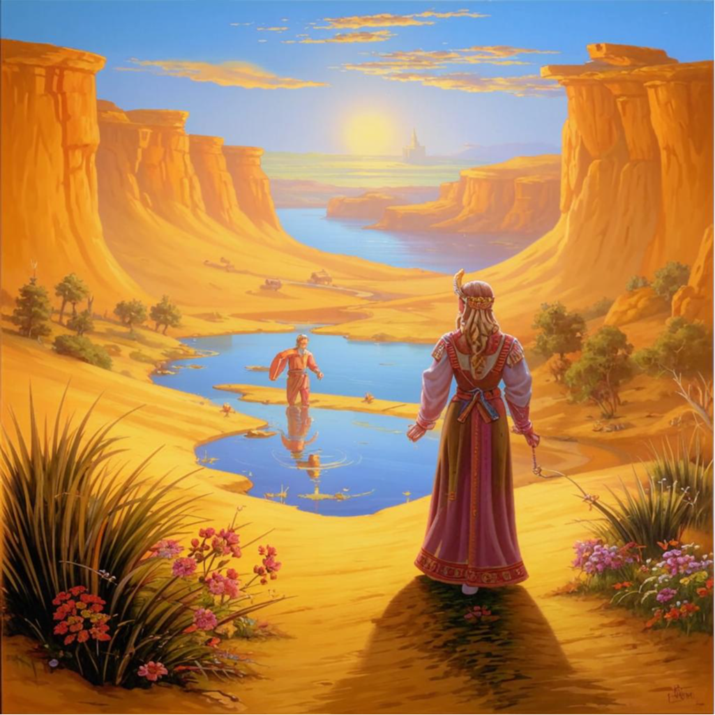 Однажды заблудившийся странник, – как водится, богатый, умный и красивый, – случайно увидел в пустыне принцессу, влюбился в нее и увез ее в свою страну; там они и поженились. Какое-то время спустя они оба решили вернуться в пустыню, в которой построили огромный цветущий город, где смогли максимально воплотиться в жизнь их мудрость, богатство и вера. «Непослушные» и прочие изгои, из которых многие считались сумасшедшими, находились в нем в полной гармонии с этой многогранной жизнью.
