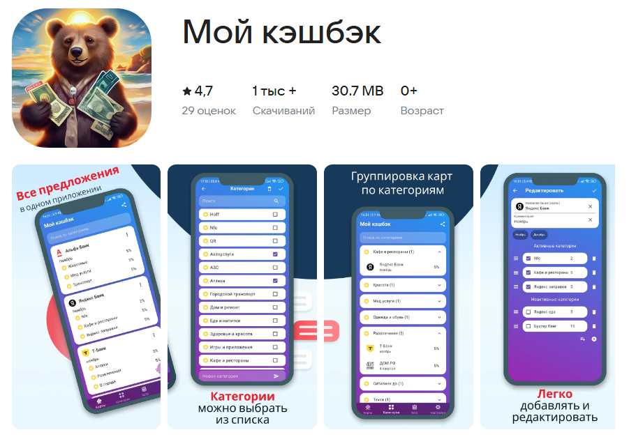 Задумывались ли вы, какую карту использовать для максимального кэшбэка? А что, если я скажу, что правильный выбор карты может сэкономить вам целые сотни рублей в месяц? Приложение «Мой кэшбэк» — это не просто список ваших карт. Это мощный инструмент для быстрого выбора карты с наибольшими бонусами, исходя из категорий покупок: Все эти данные собраны в одном месте, и теперь вы всегда будете знать, какая карта принесет вам максимальную выгоду. Скачайте «Мой кэшбэк» и начните экономить уже сегодня! Скачать из RuStore Скачать из Play Store