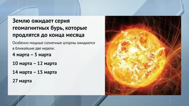 Она началась в ночь с 4 на 5 марта. Специалисты прогнозируют повышенную активность в течение всего месяца. С 10 по 12 марта ожидается период «возбужденной» зоны. 14 и 15 марта придут новые геомагнитные возмущения. Затем настанет небольшой перерыв, но уже 27 марта Земля выйдет в красную зону. В связи с этим у метеозависимых людей в течение двух недель возможны скачки давления, головные боли и общая слабость. Специалисты рекомендуют беречь себя, снизить нагрузку на организм и больше отдыхать. Людям с хроническими патологиями рекомендуется обратиться к врачу при усилении симптомов.