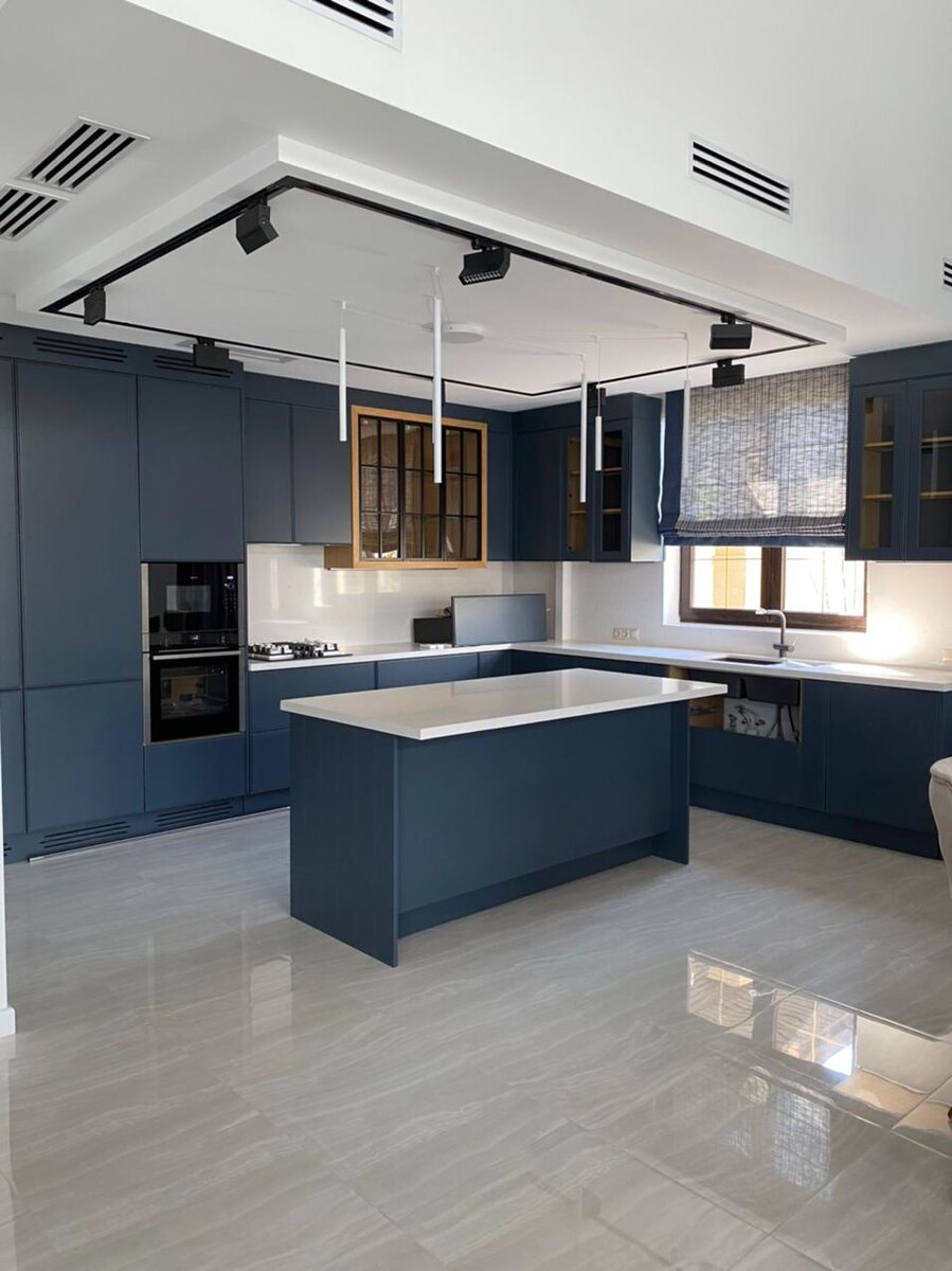 На одном из объектов нам была поставлена заказчиком трудная задача установить и подобрать кондиционер в большой зал с двойным светом в частном доме. Так чтобы была хорошая циркуляция воздуха и хорошее охлаждение. Таких мест было очень мало, так как в зале не было почти мест для установки настенного блока. Либо это были витражи, за витражами камин, с другой стороны лестница на второй этаж. Единственное место которое приходило в голову это место на кухне. Но заказчик не хотел жертвовать частью этого пространства под кондиционер. Было принято решение установить потолочный канальный кондиционер над кухонным островом. Задача была не из простых. Нам нужно было смонтировать его таким образом чтобы оставалась достаточно высоты над кухней, и еще смонтировать освещение и люк доступа для обслуживания самого канальника и самая сложная задача это прокладка дренажа, так как нужно было сделать его без устройства помпы, все должно было уходить самотеком в канализацию, через специальный сифон. Посл