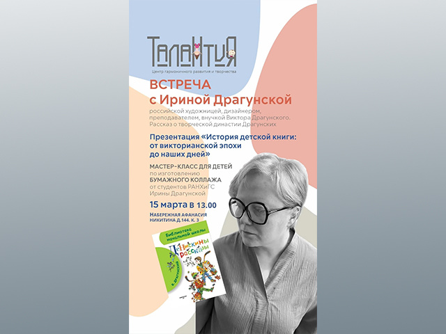 Впервые в Твери выступит внучка создателя «Денискиных рассказов» Ирина Драгунская, российская художница, дизайнер, старший преподаватель Школы дизайна РАНХиГС. Встреча пройдет 15 марта в 13.00 в Центре гармоничного развития «Талантия». Династия Драгунских любима жителями Твери – большими и маленькими. Встречи с Денисом Викторовичем всегда собирали большое количество поклонников творчества его отца Виктора Юзефовича и его самого. Сейчас будет возможность вживую пообщаться с Ириной Денисовной. Она тоже посвятила свою жизнь книге, но выбрала свой путь. Окончила Московский Университет Печати (бывший Полиграф), факультет Художественного оформления книги. С 2002 года преподаёт дизайн, типографику и композицию. Участников встречи ждет рассказ о семье Драгунских – попробуем разобраться, передается ли ген таланта по наследству. А также пройдет презентация «История детской книги: от викторианской эпохи до наших дней». Вы узнаете, как появились книги для детей и давно ли? Что было главным в их