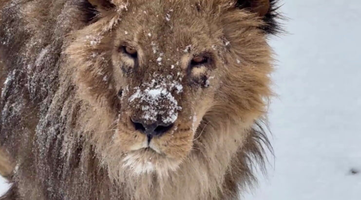Снежная прогулка: Лев Чука с удовольствием гуляет по заснеженной крымской саванне