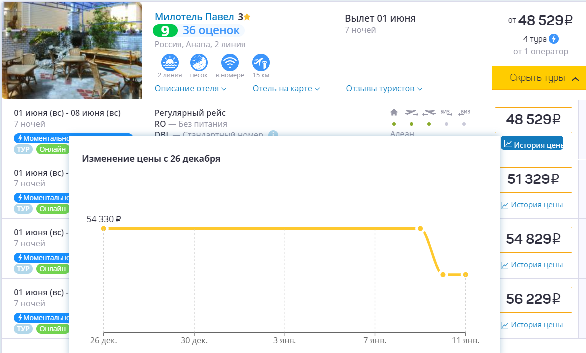 Наверное уже точно не осталось ни одного потенциального туриста, не знающего ситуацию с мазутом, который до сих пор еще не окончательно не убрали и не зачистили. И когда это произойдет, трудно сказать. Хоть нам и обещают власти, что к началу летнего сезона все будет в порядке, но верится с трудом. Недавно в своей публикации я уже анализировал цены по Анапе, и теперь есть с чем сравнивать. В начале года наметилась тенденция на снижение путевок, но это касалось пакетных туров, с перелетом из Москвы, именно за счет перелета Начало января, пакетный тур на двоих на 7 ночей, с вылетом 1 июня стоил 48.5 т.р на двоих, до НГ было 54 т.р. Сейчас рост до 59.5 т.р. при тех же параметрах, но это опять же за счет перелета Так как отель цены не поднимал и не снижал Я сравнил несколько отелей, ситуация однотипная. Нет ни какой реакции на текущий новостной фон Возможно кто-то и снизил цены, но этого пока нет в массовом порядке. Я так понимаю, почему-то отельеры надеются на хороший спрос и заполняе