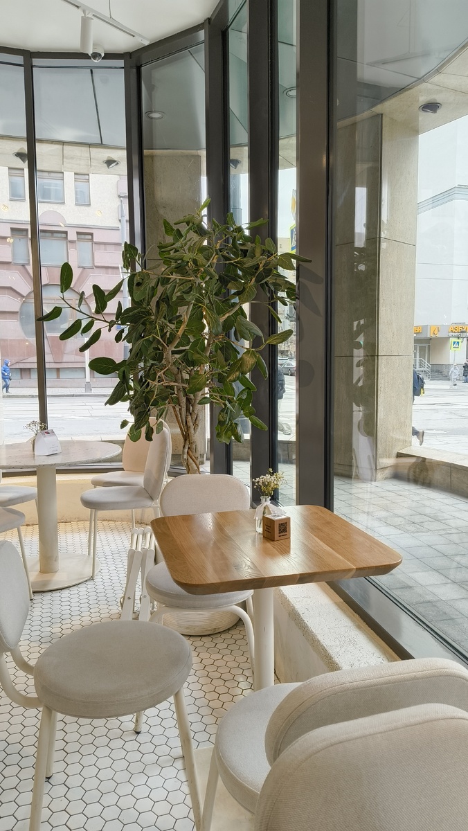 В этом приятном и светлом интерьере за высокими окнами, огибающими половину интерьера кафе, можно наблюдать за погодой в любое время суток. На завтрак — вафля бенедикт с лососем и травяной чай. Вафля очень хрусткая, нежная, несладкая, на ней яйцо-пашот, укрытое толстым слоем голландского соуса и хорошей порцией лосося с листами зелени. Вафля очень вкусная, это почти идеальный завтрак. Душистый травяной чай с ромашкой подают заваренным в кружку. Посуда приятных пастельных тонов, хорошие столовые приборы подают в лотке. Интерьер: светлая плитка, немного дерева и сногсшибательная шестиугольная маленькая плитка «кабанчик». Мне нравится видеть кухню и сервировку, здесь я с удовольствием попеременно наблюдал за работой персонала и происходящим за окном. Расположено кафе чрезвычайно удачно. Это место подходит для: - перекуса на бегу, - обеденного перерыва, - встречи с другом или подругой, - чтобы посидеть небольшой компанией, - вполне подойдёт и для свидания.