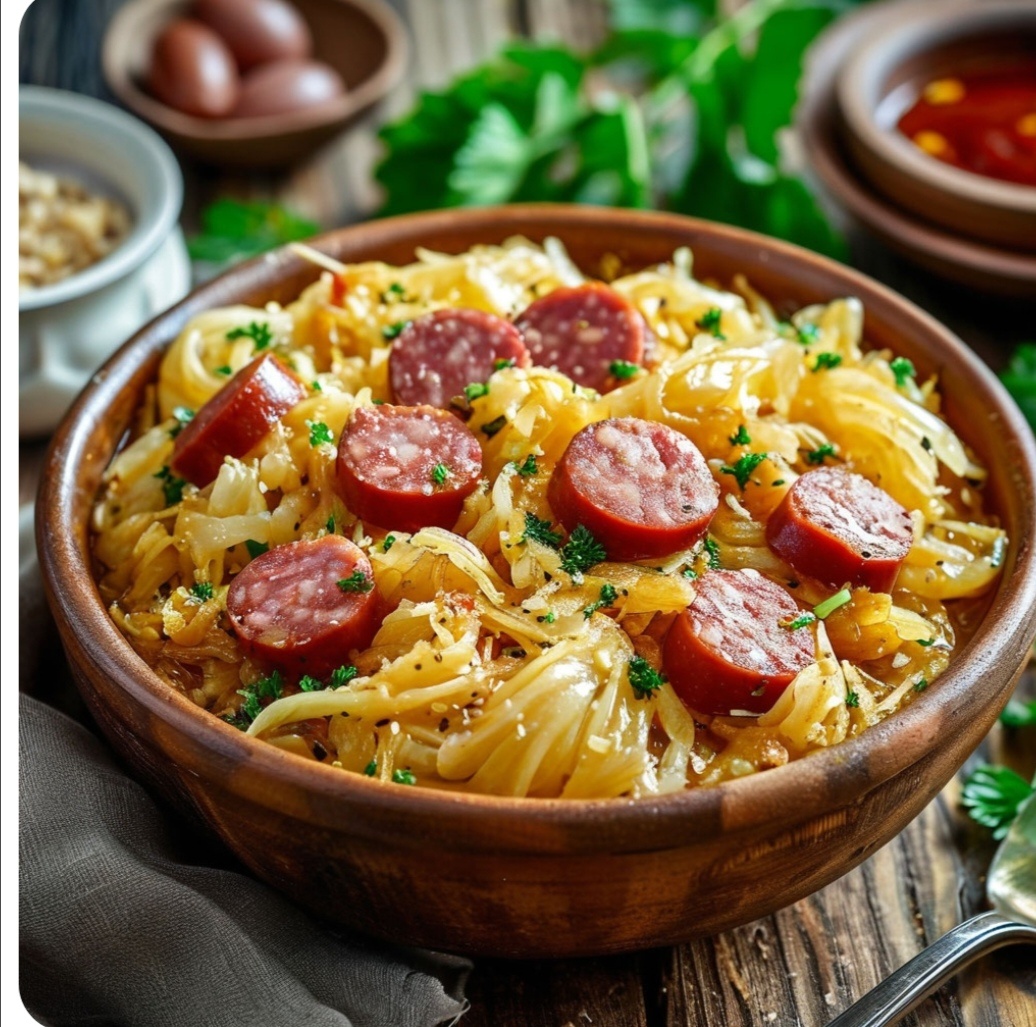 Для приготовления необходимо: - Колбаса сырокопченная 50-100 грамм - Капуста маленький вилок 500 грамм 1 штука -Помидор 1 штука или ложка томатной пасты. -Растительное масло 20 мл. - Соевый соус 1 столовая ложка - Соль полчайной ложки - Яблочный уксус или виноградный (обычно он не более 6%) - 1 чайная ложка это 5 мл. - Сахар полчайной ложки - Перец чёрный щепотка по вкусу 1 грамм. Для приготовления необходимо: -Разрезать капусту на 4 части и в дальнейшем нарезать её ножом, или можно нашинковать на очень крупной терке. Оставить в чашке. -Нарезать колбасу на кружочки и затем из кружочков сделать соломку. Можно оставить кружочки если так нравиться. Нарезать помидор на кубики и оставить в чашке. -Ставим сковородку на умеренный огонь наливаем масло выкладываем колбасу. Обжаривать до лёгкой золотистой корочки. Затем добавляем ложку томатной пасты или кубики помидора, обжариваем до образования однородной массы. В конце добавляем немного сахара, уксуса (если не любите, можно не испол