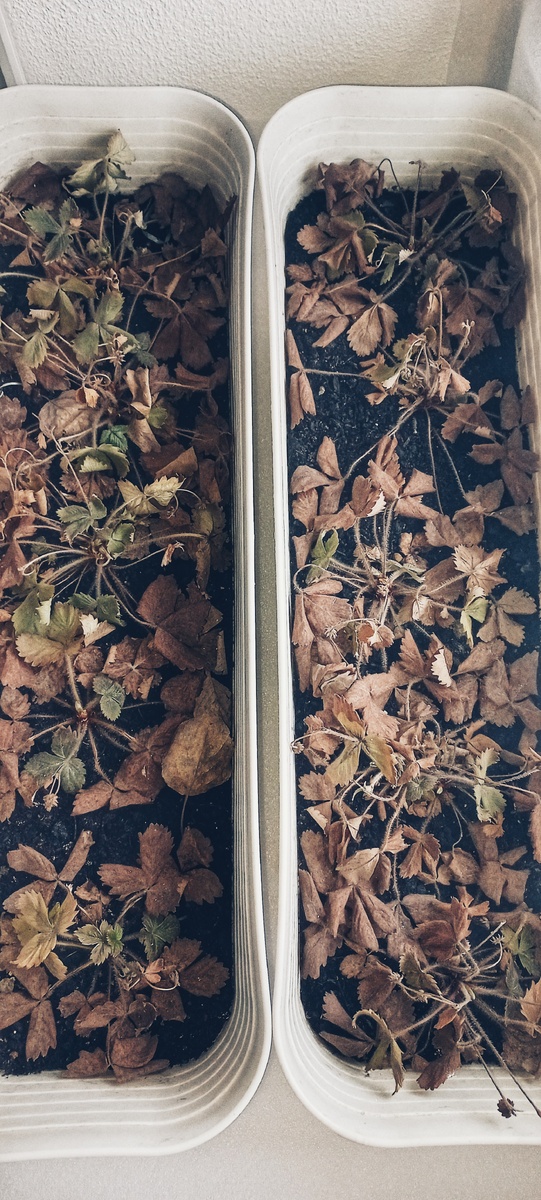 Эта зима не была слишком холодной, но ночами заморозки всё же случались. Ремонт в нашей квартире шёл уже несколько месяцев и мои земляничные кусты были выставлены на незастекленный балкон еще в июле. Всю зиму я с недоумением смотрела сквозь холодное стекло на свою землянику, иногда укутанную снегом и морозом и каждый раз меня посещало чувство безнадежности. С приходом весны, когда солнце стало нагревать воздух, и ремонтные работы уже немного стихли, я решила занести кашпо с кустами домой. При этом сердце наполняло радостное волнение - вдруг они всё же выжили?! Я аккуратно поставила их на подоконник, куда падали солнечные лучи и стала наблюдать, как жизнь возвращается к растениям. Первые дни изменений не предвещали, но совсем скоро я заметила, как на кустах начали распускаться новые, крохотные, светло-зеленые листики, а из почек появились новые побеги. Мои кусты земляники оживают и я с нетерпением предвкушаю, когда появятся нежные, маленькие, хрупкие цветочки и медово-сладкие, аромат