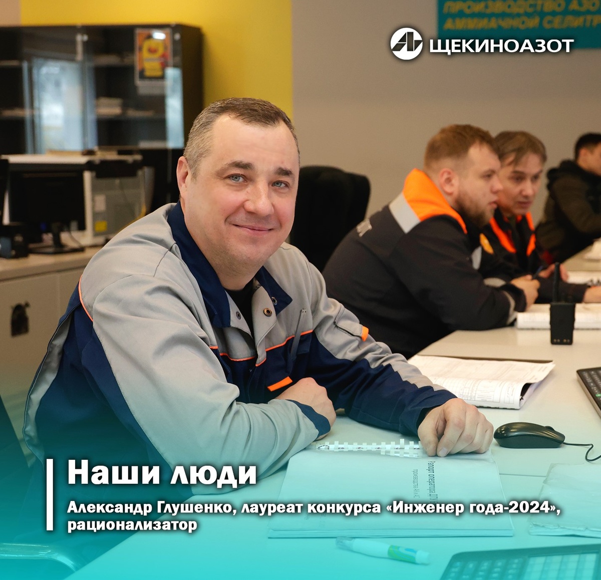 Александр Глушенко, лауреат конкурса «Инженер года-2024», рационализатор В проекте «Наши люди» - новый участник: Александр Глушенко, старший механик производства АК/АС. С успехом окончив Горловское ВПУ №37, молодой электрогазосварщик решил не останавливаться и получить высшее образование. И в 2005 году в профильном университете он защитил диплом инженера-механика по специальности «Оборудование химических производств и предприятий строительных материалов». Александр Глушенко, работая на производстве, постоянно находил пути для расширения профессиональных знаний. В его портфолио – множество сертификатов о пройденных курсах повышения квалификации от ведущих мировых фирм в области турбокомпрессорного и насосного оборудования. В 2020 году он приехал из родных донецких степей в Щекино – строить современное, уникальное производство. В АО «Щекиноазот» Александр вошел в состав проектной группы в должности механика по обслуживанию динамического оборудования будущего производства. Как
