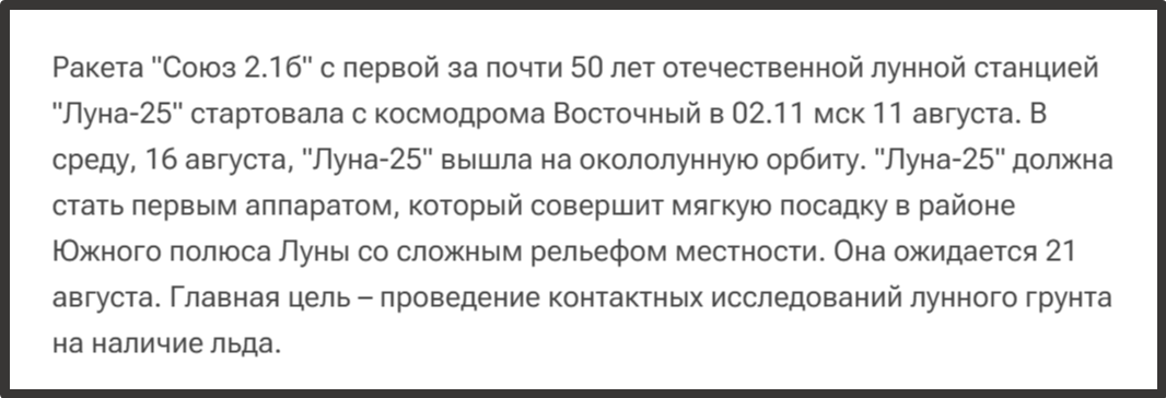 Совершить посадку на Луну в настоящее время не большое достижение. Мягкая посадка Луны-9 произошла в 1966 году. Сколько с тех пор посадили разных летательных средств на наш спутник и не счесть. Но сажали в основном в центральной части Луны. На экваторе или недалеко от него. В 2023 году Россия запустили АМС Луна-25. Намечалась мягкая посадка. Так в чем достижение? Казалось бы СССР, а Россия считает себя преемником Советского Союза, мягко посадила АМС в 1966 году. А тут 2023. Чем хвалиться? Пресса тогда писала: "Будем садиться около Южного Полюса Луны. А это очень сложно!" Чем южнее, тем сложнее. Если почитать заголовки то получается, что собирались сажать чуть ли не на самый полюс. Но если внимательно почитать не заголовки, посмотреть на карту, то получается, что широта посадки была около 69 градуса. А это широта Мурманска. Мурманск на полюсе? А теперь через пару часов посадку попробует совершить АМС "Nova-C". И широта посадки у этого аппарата не 69 градусов, а 84. А это уже реально пол