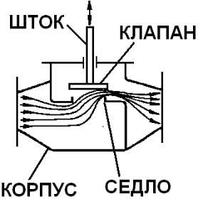 Вентиль перекрывает проход газа перемещением запорного органа (золотника, клапана) в направлении, параллельном оси потока (рис.1). Клапан размещается на штоке, который обеспечивает его перемещение относительно седла. В запорной арматуре применяется шток с выполненной на нем резьбой, которая обеспечивает надежное прижатие клапана к седлу. Другая трубопроводная арматура с корпусами вентильного типа - регуляторы давления газа. У них шток клапана свободно двигается в направляющей, перемещая сам клапан относительно седла, что обеспечивает изменение прохода газа.