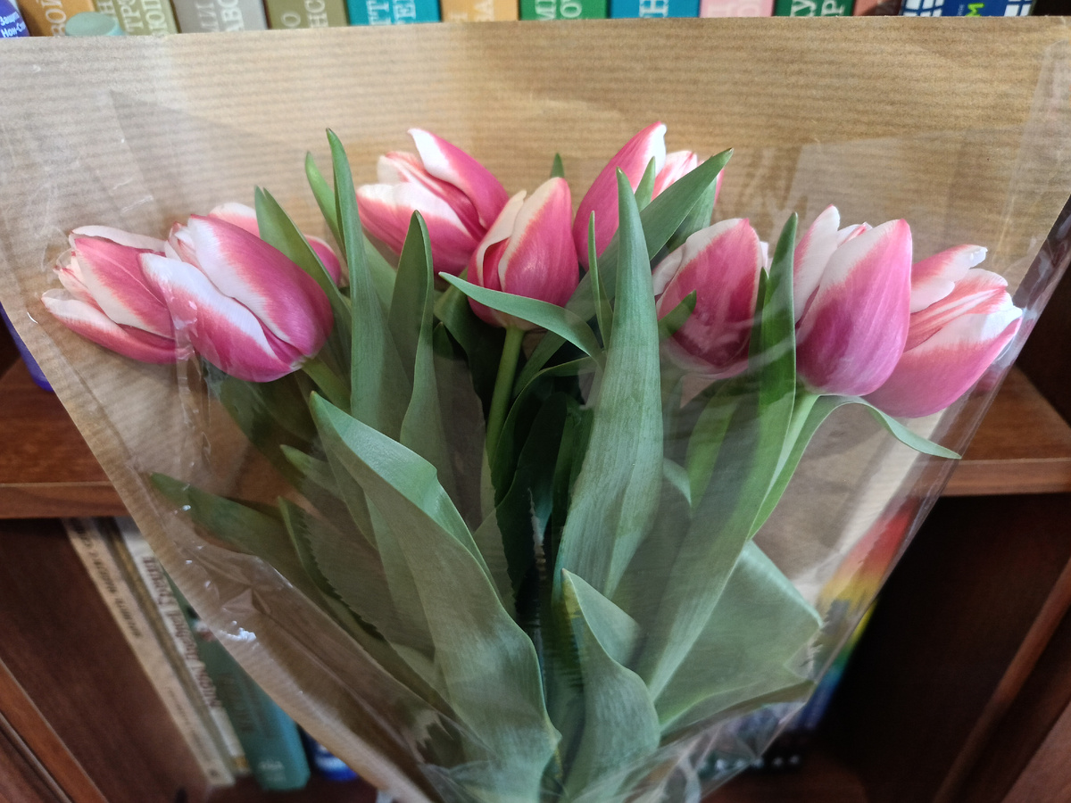 Привет всем ! Денёк сегодня выдался тот ещё.... Тяжёлый, но всё равно хороший. Зато завтра буду выходная, вот так вот ! Как говорится, план сегодня выполнила и перевыполнила , завтра наши девчонки-швеи отдыхают ( они работают по 12 часов два через два ), так что и мне можно отдохнуть, другие свои дела я тоже сделала с опережением. 😁 Сегодня нас приходили поздравлять наши депутаты, подарили каждой по букетику тюльпанов. Приятно, чёрт побери ! Теперь у меня два букета. 😊 Про букет во вчерашней статье 👇 А ещё я в магните купила розочки и гиацинты, весь дом благоухает ! 😊 Мой благоверный завтра после работы уезжает с друзьями на север на рыбалку на 2 дня , поэтому мы, наверное, сегодня немного отметим праздник. Рацион у меня был такой, на завтрак горячий бутерброд и кофе На работу брала пюре и тушёную с фаршем капусту. После работы съели с мужем по хурме и один грейпфрут на двоих, чай пили с творожными печеньками. На ужин будут жареные на гриле атяшевские колбаски, пюре, салат , маслин